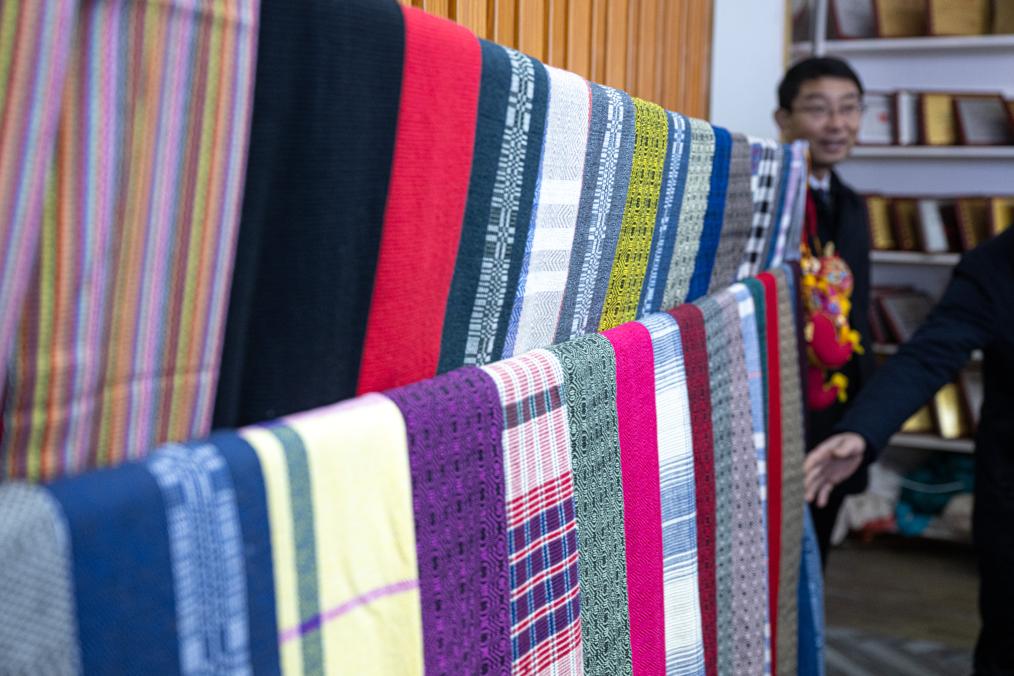 展示间挂放着各色各样的大布围巾。新华社记者肖艺九 摄