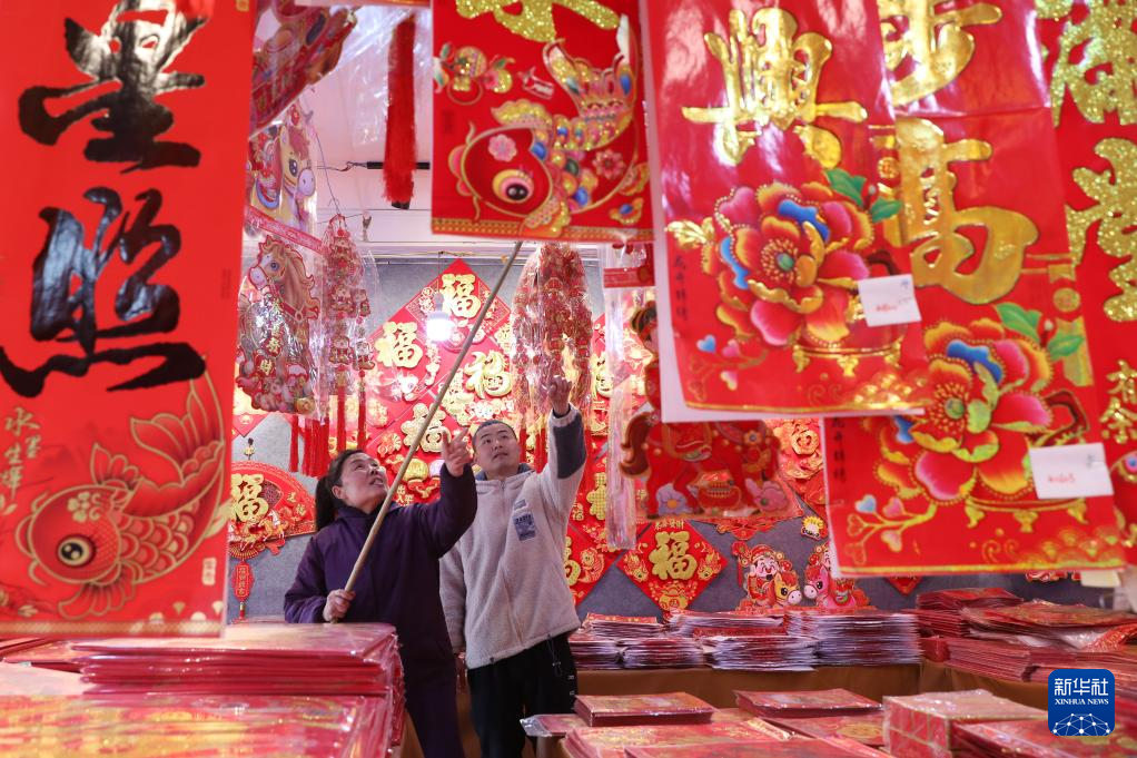 1月25日,顾客在河南省焦作市温县赵堡镇赵堡村年货市场选购春联、年画。