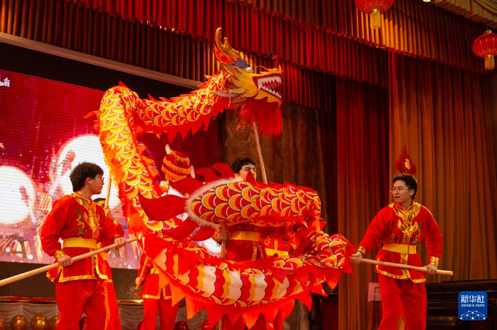 这是2月4日在阿塞拜疆首都巴库拍摄的“骏马迎春 中阿同心”春节庆祝活动上的舞龙表演。