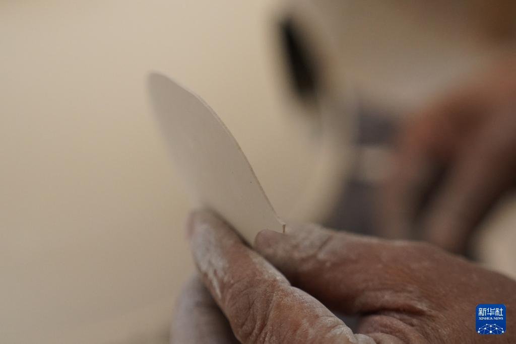 卢建德轻轻敲打薄胎瓷碗坯体,以此判断厚度是否达标(3月10日摄)。