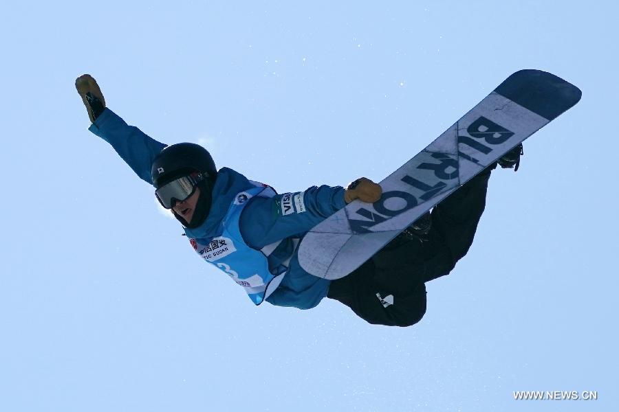 Japan's Katayama Raibu competes during the men's competition of 2017-2018 FIS Snowboard Halfpipe World Cup held at Genting Resort Secret Garden in Chongli District of Zhangjiakou City, north China's Hebei Province, Dec. 21, 2017. Katayama Raibu won the second place of the event with 90.75 points.(Xinhua/Ju Huanzong)
