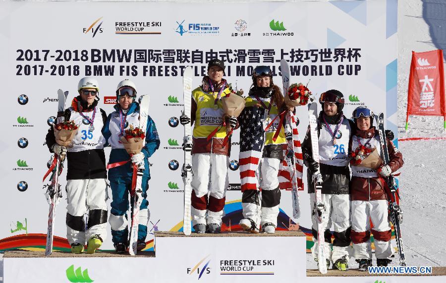 (Fron L to R)Winners Matt Graham of Australia, Yulia Galysheva of Kazakhstan, Mikael Kingsbury of Canada, Jaelin Kauf of the United States, Troy Murphy of the United States and Andi Naude of Canada pose on the podium after the men's Moguls and ladies' Moguls on the Day 1 of the 2017-2018 Freestyle Skiing World Cup-Moguls & Aerials at the Thaiwoo ski resort in Chongli District of Zhangjiakou City, north China's Hebei Province, Dec. 21, 2017. (Xinhua/Meng Jing)