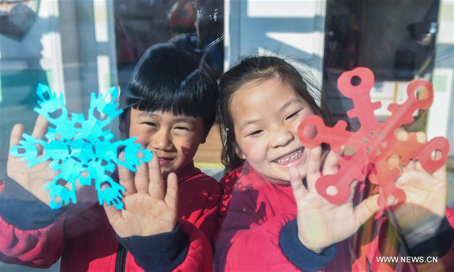 Children put the paper cutting snowflakes on the window to celebrate the upcoming Winter Solstice festival at a kindergarten in Lijiaxiang Township in Changxing County, east China's Zhejiang Province, Dec. 21, 2017. Winter Solstice, the shortest day of the year, falls on Dec. 22 this year. In Chinese culture, it marks the beginning of deep winter and a break from farming in traditional agricultural society. It is also a time for family gatherings. (Xinhua/Xu Yu)