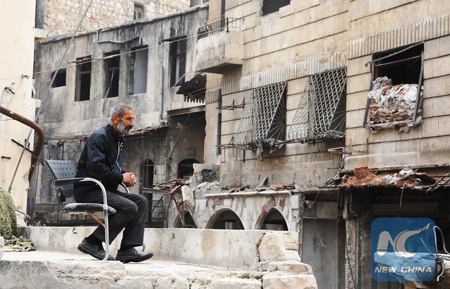Maher Khayata, a 60-year-old man, sits on the rooftop of a shattered shopping compound in the Old City of Aleppo, northern Syria, on Dec. 21, 2017. (Xinhua/Ammar Safarjalani)