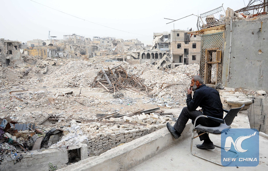 Maher Khayata, a 60-year-old man, smokes on the rooftop of a shattered shopping compound in the Old City of Aleppo, northern Syria, on Dec. 21, 2017. (Xinhua/Ammar Safarjalani)