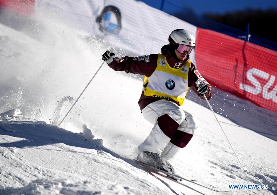 Mikael Kingsbury of Canada competes during the men's Moguls on the Day 2 of the 2017-2018 Freestyle Skiing World Cup-Moguls & Aerials at the Thaiwoo ski resort in Chongli District of Zhangjiakou City, north China's Hebei Province, Dec. 22, 2017. Mikael Kingsbury claimed the title with 85.94 points. (Xinhua/Wang Xiao)