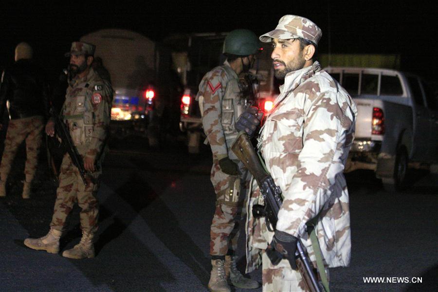 Pakistani soldiers stand guard near an attack site in Quetta, Pakistan, on Jan. 2, 2018. At least 12 people including five security personnel were injured in a terrorist attack at a checkpoint in Pakistan's southwest city of Quetta on Tuesday evening, local Urdu TV Channel Dunya reported. (Xinhua/Asad)