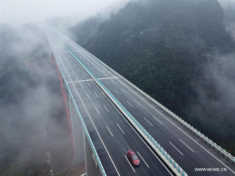 Vehicles run on the Xianghuoyan Bridge of the new highway linking Zunyi and Guiyang of southwest China's Guizhou Province, Jan. 2, 2018. (Xinhua/Zhang Hui)
