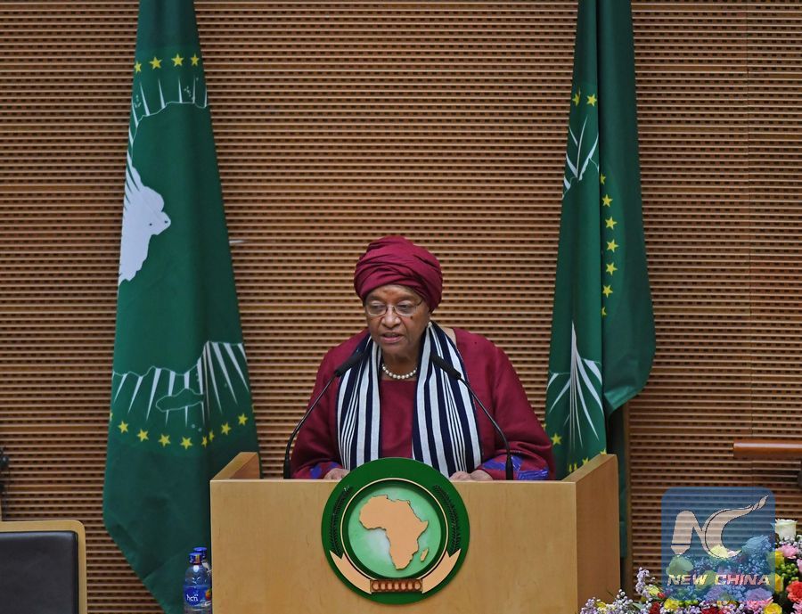 File photo shows Liberian President Ellen Johnson Sirleaf addressing the closing session of the 29th African Union summit in Addis Ababa, capital of Ethiopia, on July 4, 2017. (Xinhua/Chen Cheng)