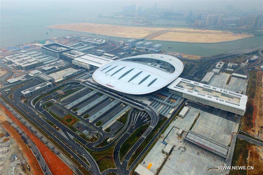 Aerial photo taken on Jan. 26, 2018 shows the port of the Hong Kong-Zhuhai-Macao Bridge in Zhuhai, south China's Guangdong Province. The port projects of the world's longest sea bridge have been completed, an official in south Guangdong said Friday. Installation and testing of the equipment linking the ports and the main part of the 55-km bridge are underway. (Xinhua/Liang Xu)