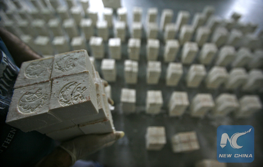 (File photo)A Palestinian worker holds soap pieces at the Touqan factory in the West Bank city of Nablus, on Oct. 8, 2012. The Touqan factory is one of the oldest manual factories in Nablus that manufactures the natural "Nabulsi Soap" since 1894. (Xinhua/Ayman Nobani)