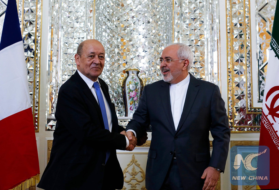 Iran's Foreign Minister Mohammad Javad Zarif (R) shakes hands with French Foreign Minister Jean-Yves Le Drian as they meet in the capital Tehran on March 5, 2018. (AFP photo)