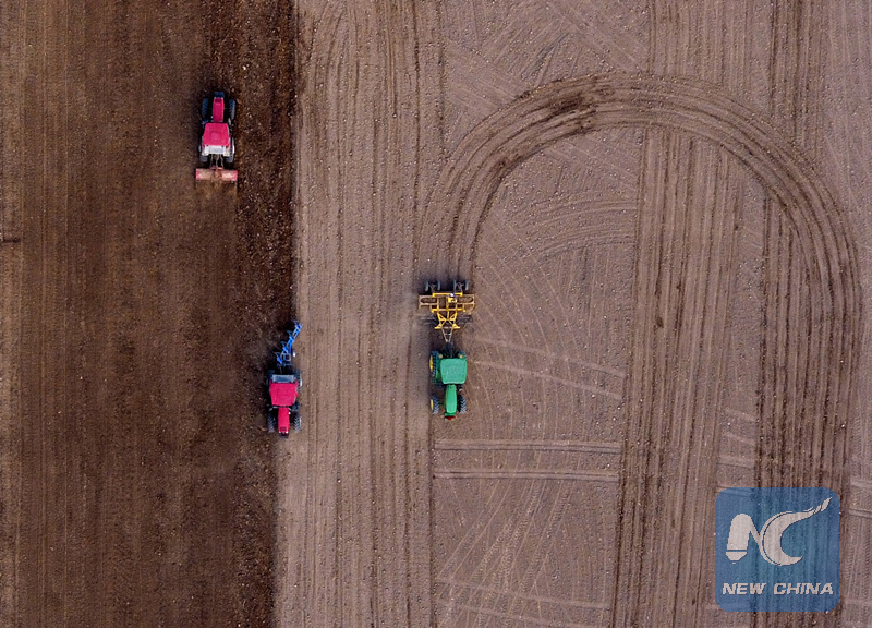 Aerial photo taken on March 14, 2018 shows agricultural machineries ploughing the field at Duzhuang Village of Huaxian County, central China's Henan Province. (Xinhua/Li Jianan)