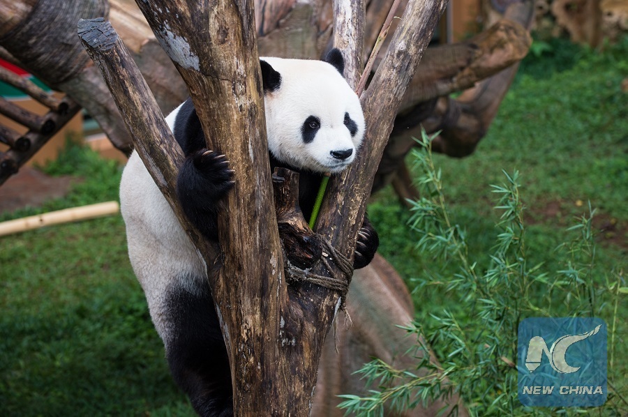 Photo taken on March 24, 2018 shows the giant panda Caitao at Taman Safari Indonesia in Togor,Indonesia, March 24, 2018. (Xinhua/Du Yu)