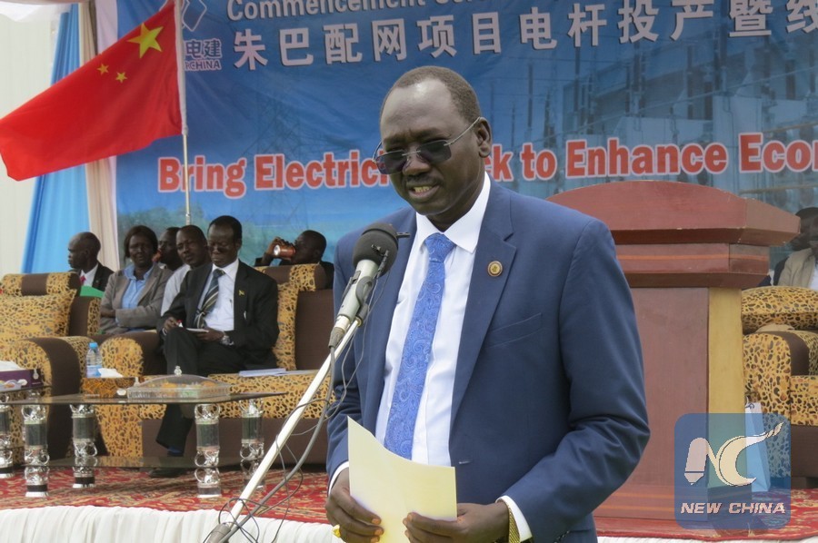 South Sudan's Minister of Dams and Electricity Dhieu Mathok delivers his speech during the launch of the newly built power poles factory along Yei road in Juba, capital of South Sudan, April 16, 2018. (Xinhua/Denis Elamu)