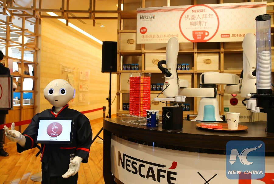 Softbank's humanoid robot "Pepper", co-established by Nestle Japan and Chinese digital payment company Ant Financial, works at a coffee shop in Tokyo, Japan, Feb. 8, 2018. (Xinhua/Qian Zheng)