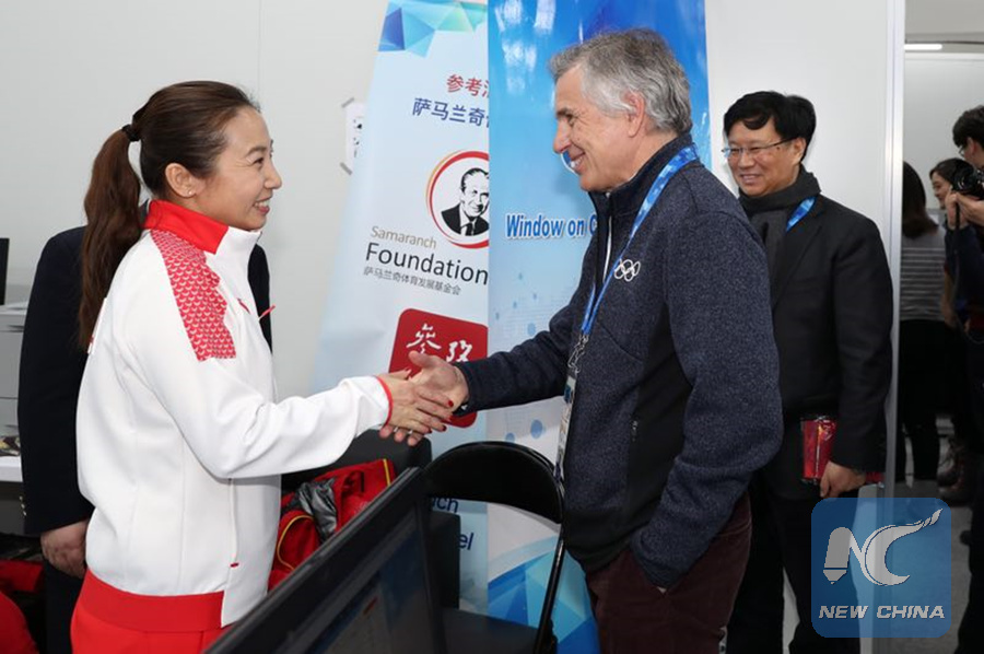 Juan Antonio Samaranch Jr. (middle) runs into the Chinese short track speed skating coach Li Yan when visiting Xinhua's newsroom during PyeongChang 2018 Winter Games inFebruary, 2018. (Xinhua)