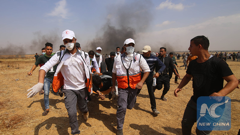 GAZA, April 27 (Xinhua) -- Three Palestinians were killed and 350 others wounded on Friday during clashes between dozens of Palestinian demonstrators and Israeli soldiers in eastern Gaza Strip, said medics.
