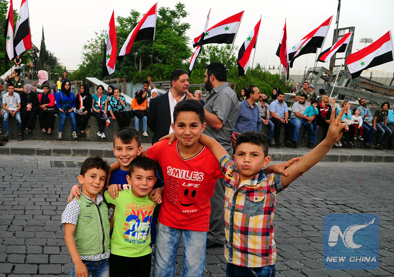 Syrians hold Syrian flags during a concert commemorating the Martyr's Day at al-Abassyeen square in Damascus, capital of Syria, on May 6, 2018. (Xinhua/Ammar Safarjalani)