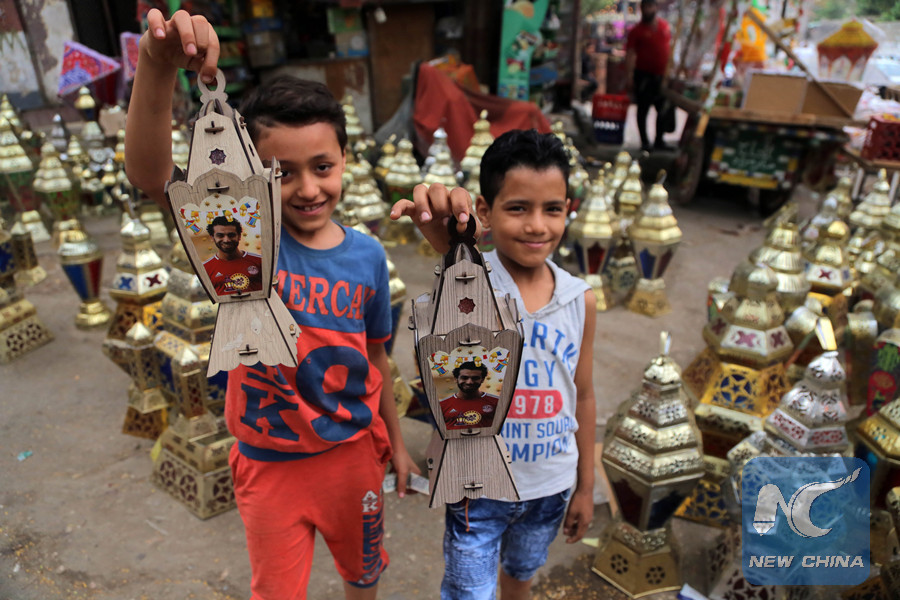 Traditional lanterns with images of football star Mohamed Salah are seen in a market in Cairo, Egypt, on May 4, 2018. (Xinhua/Ahmed Gomaa)