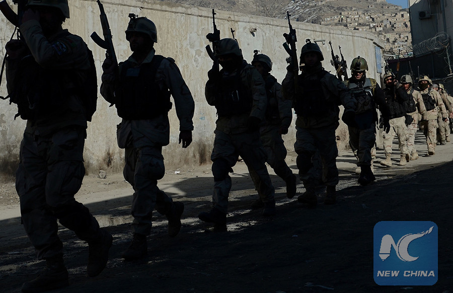 In this file photo taken on January 21, 2013 Afghan commandos walk down a road near the Kabul police headquarters building after a clash between Afghanistan forces and Taliban fighters in Kabul. (AFP photo)