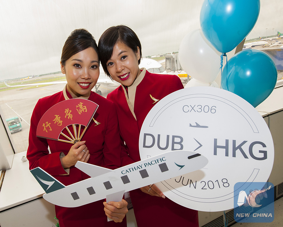 Photo sourced from Dublin Airport shows Cathay Pacific cabin crew members at the launch of the first direct flight from Dublin to Hong Kong at Dublin Airport, Dublin, Ireland, June 2, 2018. The first direct Hong Kong-Dublin flight service was launched here on Saturday.