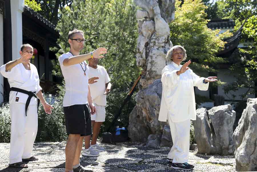 People learn to practise Tai Chi at Chinese Scholar's Garden in New York, the United States, on Sept. 23, 2017. The annual Asian-themed festival features activities including performances of Asian music and dance, demonstrations of martial arts, lessons in Chinese calligraphy was held at Chinese Scholar's Garden to celebrate the Autumn Moon Festival on Saturday. (Xinhua/Wang Ying)