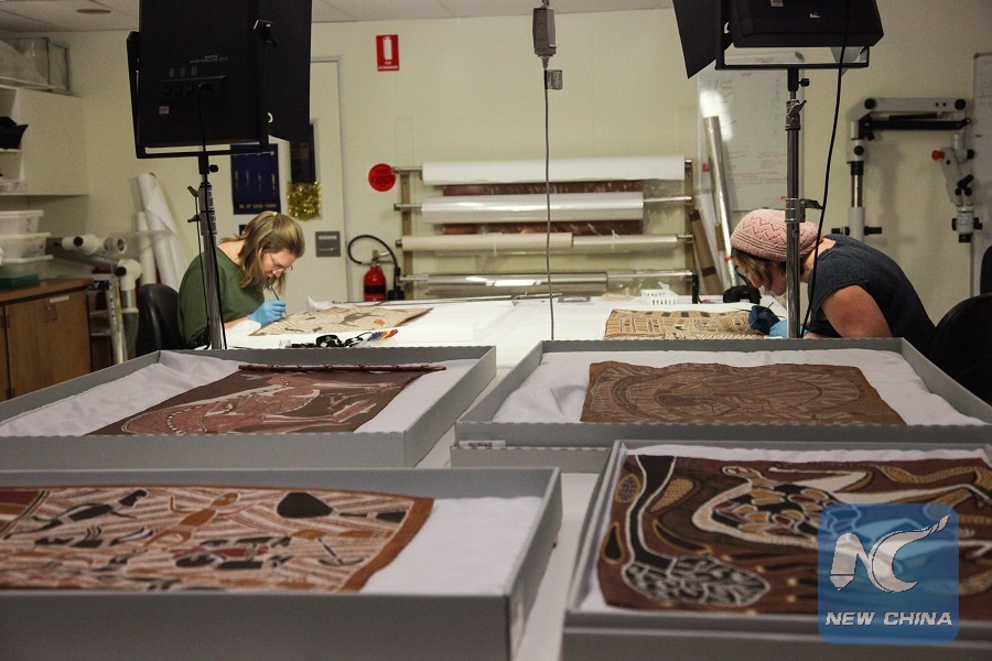 Conservation workers repair bark paintings, which will be shipped to China for exhibition, at the National Museum of Australia in Canberra, Australia, on May 3, 2018. (Xinhua/Xu Haijing)