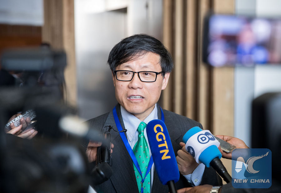 File photo of Kuang Weilin, head of the Chinese mission to the African Union (AU), speaking to media at the AU headquarters in Addis Ababa, capital of Ethiopia, Jan. 29, 2018. (Xinhua/Lyu Shuai)