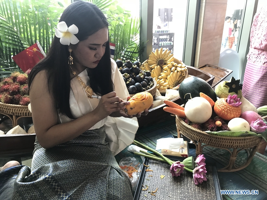 Staff carves a papaya at the Thai Festival 2018 “Spice up Your Day with Thai Tastes”. The festival was held at the Royal Thai Embassy, Beijing, June 23, 2018. This is the second time that the Thai Festival is organised here as guests can enjoy various activities in the midst of Thai surroundings. (Xinhuanet/Liang Yurou)