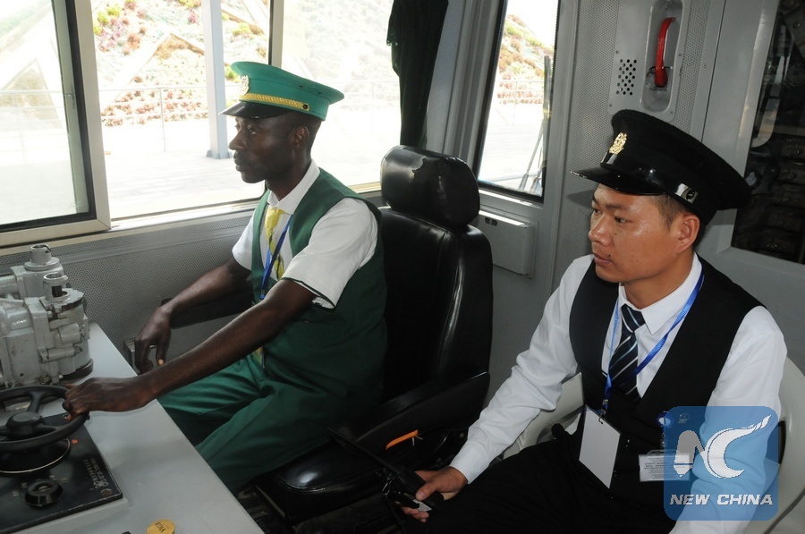 A local driver conducts the train with the help of a Chinese driver in Abuja, Nigeria, July 12, 2018.(Xinhua/Zhang Baoping)