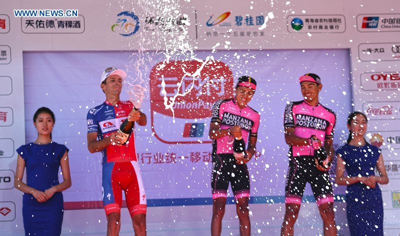 Winners celebrate at the award ceremony of the fourth stage of the Tour of Qinghai Lake in northwest China's Qinghai Province, on July 25, 2018. (Xinhuanet Photo by Yang Shoude)