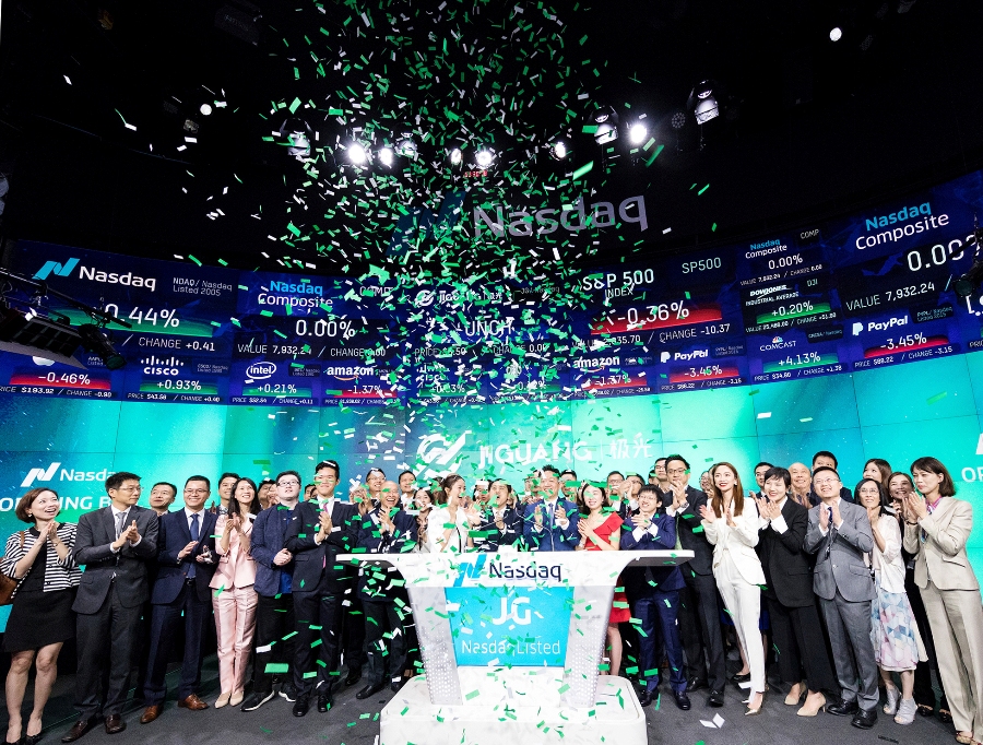 China's mobile big data solutions platform Aurora Mobile Limited debuted on the Nasdaq stock exchange on July 26, 2018. (Xinhua Photo)