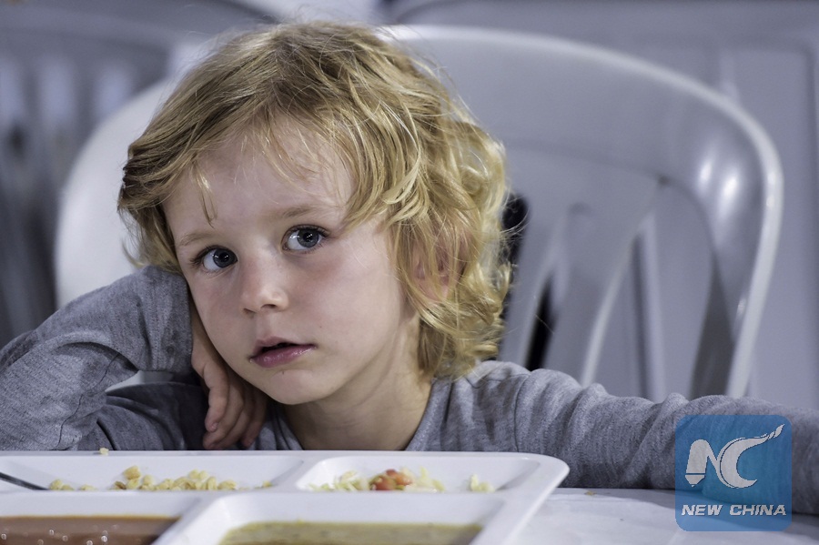 A child sits as he and others receive a free Iftar meal as they break their fast during the last day of the Muslim holy month of Ramadan on June 14, 2018 in the Kosovo capital Pristina. (Xinhua/AFP PHOTO)