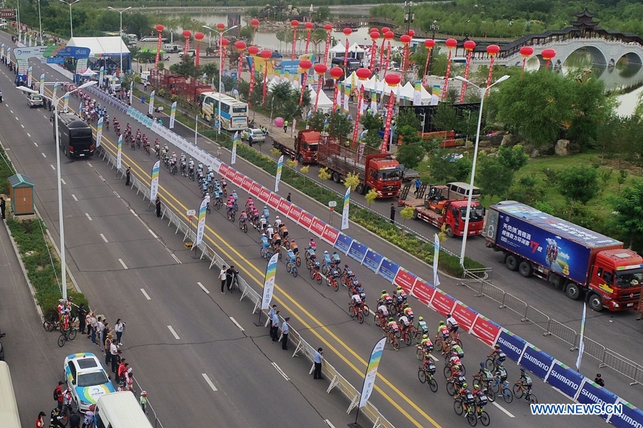 Cyclists compete in the twelfth stage of the Tour of Qinghai Lake in Yinchuan, northwest China's Ningxia Hui Autonomous Region, on August 3, 2018. (Photo by Lu Mi)