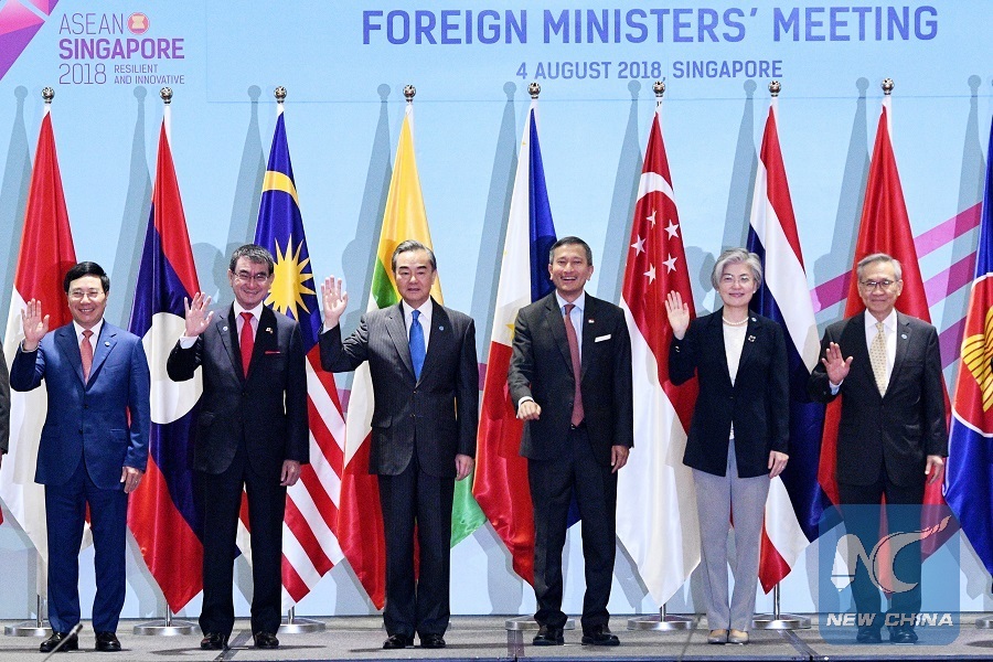 Chinese State Councilor and Foreign Minister Wang Yi (3rd L) poses for a group photo during the foreign ministers' meeting of the 10 member states of the Association of Southeast Asian Nations (ASEAN) and China, Japan and South Korea (10+3) held in Singapore, Aug. 4, 2018. (Xinhua/Then Chih Wey)