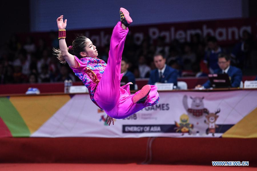 Tsai Wenchuan of Chinese Taipei competes during the Women's Nanquan & Nandao All-Round at the 18th Asian Games in Jakarta, Indonesia Aug. 19, 2018. (Xinhua/Pan Yulong)