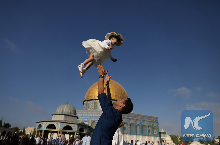A Palestinian man throws his child in the air following morning prayers marking the first day of Eid al-Adha celebrations, on the Al-Aqsa Mosque compound in Jerusalem's Old City on Aug. 21, 2018. (Reuters photo)