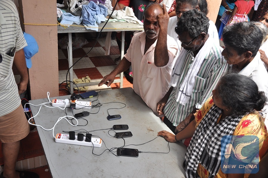 People in flood-hit India's southern state of Kerala charge their mobile-phones at a relief camp inside the 'Parumala Seminary' in Chengannur area. (Xinhua/Stringer)