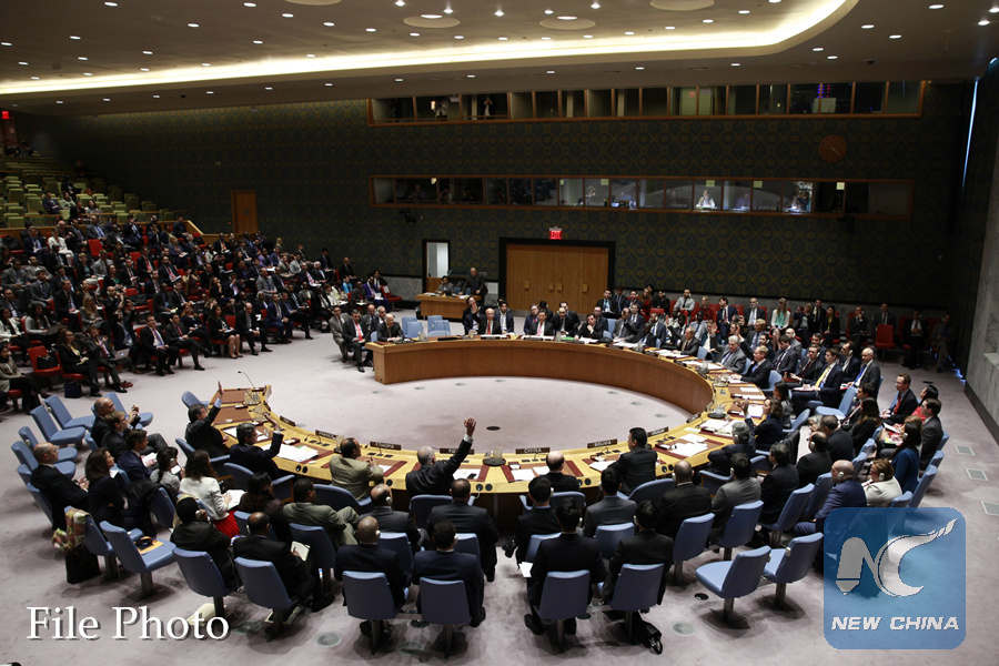Photo taken on April 12, 2017 shows the United Nations Security Council voting on a draft Security Council resolution on an alleged chemical attack in Syria's northwestern province of Idlib at the UN headquarters in New York. (Xinhua/Li Muzi)