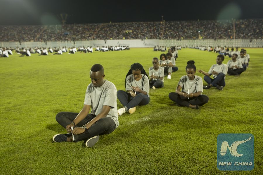 File photo shows people hold candles during an event in commemoration of the 1994 genocide in Kigali, capital of Rwanda, on April 7, 2018. (Xinhua/Gabriel Dusabe)