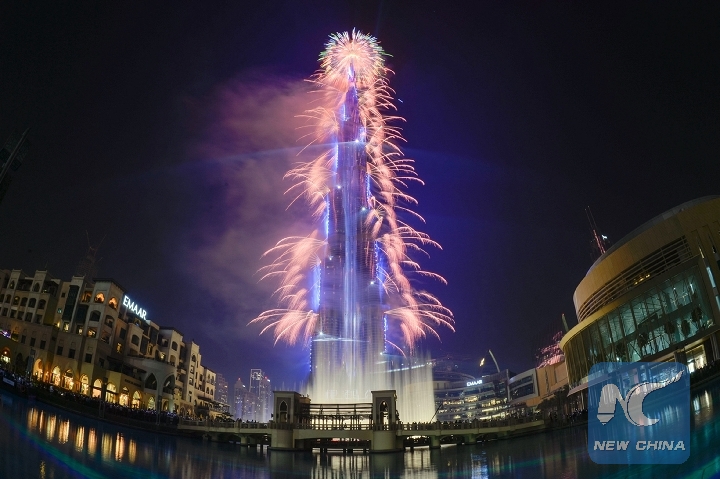 Fireworks are seen at the Burj Khalifa on New Year's Eve in Dubai, the United Arab Emirates, Jan. 1, 2019. (Xinhua)