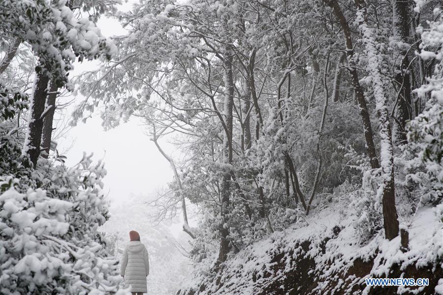 A woman views snow scenery at Longshan Park in Shaoxing City, east China's Zhejiang Province, Dec. 31, 2018. Snowfall and sleet hit Zhejiang Monday. (Xinhua/Weng Xinyang)