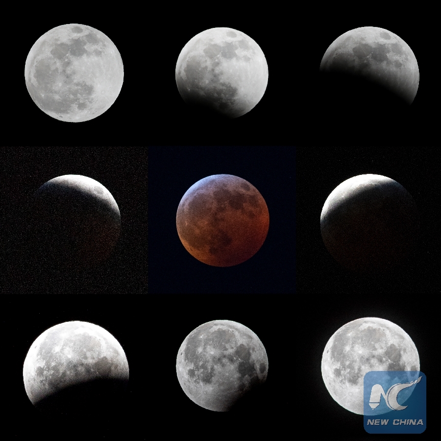 Combination photo taken on Jan. 20 and Jan. 21, 2019 shows the change of moon (from L to R and top to bottom) during a total lunar eclipse in the sky of New York, the United States. (Xinhua/Wang Ying)