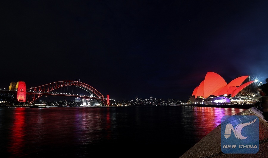SYDNEY, Feb. 4 (Xinhua) -- The white sails of the Sydney Opera House glowed red on Monday night in celebration of the Lunar New Year.