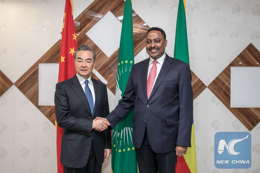 File photo shows Chinese State Councilor and Foreign Minister Wang Yi (L) shaking hands with Ethiopian Foreign Minister Workneh Gebeyehu during their meeting in Addis Ababa, Ethiopia, on Jan. 3, 2019. (Xinhua/Zhang Yu)