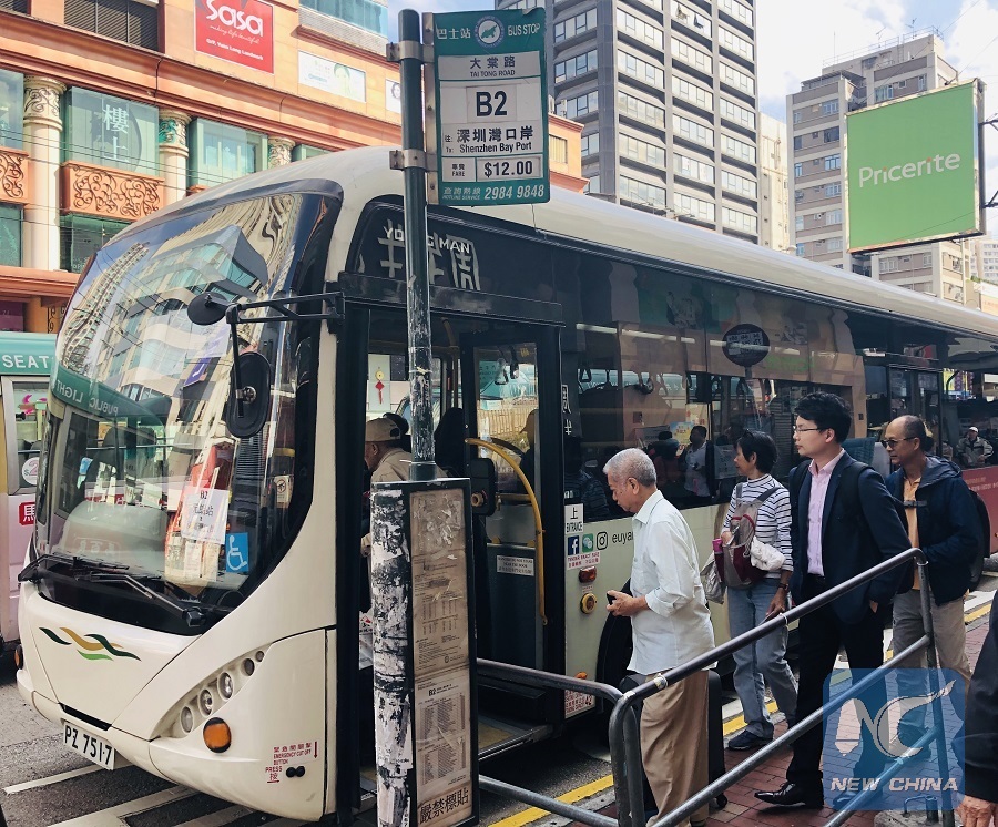 Abraham Lam (2nd R) prepares to get on a bus heading to Shenzhen Bay Port at a bus stop in Yuen Long of Hong Kong's New Territories, Feb. 14, 2019. (Xinhua/Gao Jie)