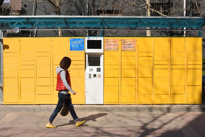 A woman passes through a self-service site for package delivery and pickup in Tangshan City, Hebei Province. (Xinhua/Li Junyi)