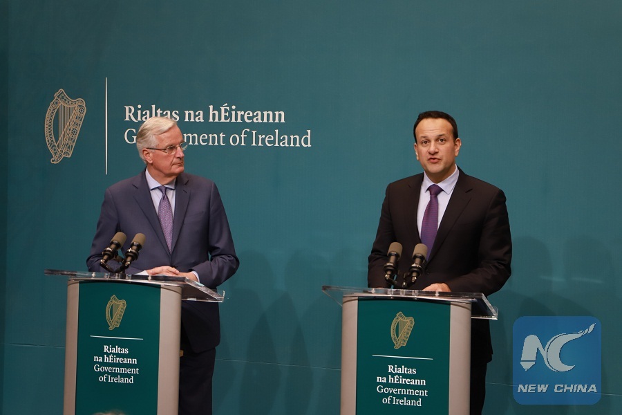 European Union (EU) chief Brexit negotiator Michel Barnier (L) and Irish Prime Minister Leo Varadkar attend a press briefing after their meeting at Government Buildings in Dublin, Ireland, April 8, 2019. (Xinhua)