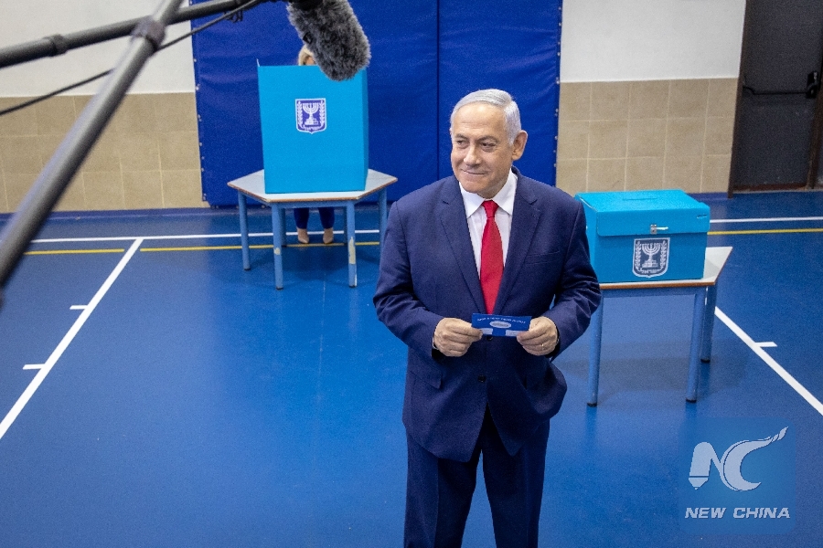 Israeli Prime Minister Benjamin Netanyahu casts his ballot at a voting station in Jerusalem, during Israel's parliamentary elections on April 9, 2019. (Xinhua/JINI/Emil Salman)